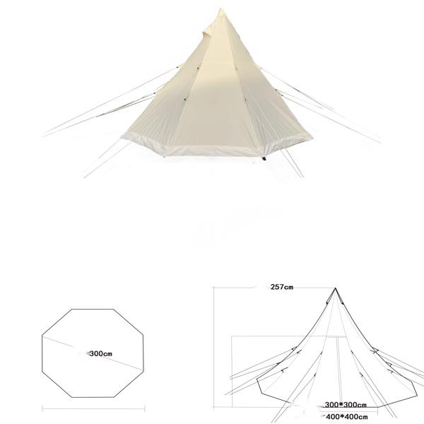 • [Spacious 9.85ft Tipi Tent]The "9.85ft Tipi Tent" is a luxury canvas bell tent designed to comfortably accommodate 3-4 people. Measuring 9.85ft x 9.85ft x 8.4ft, it features a lightweight yet sturdy aluminum center pole, providing an ideal blend of portability and stability.